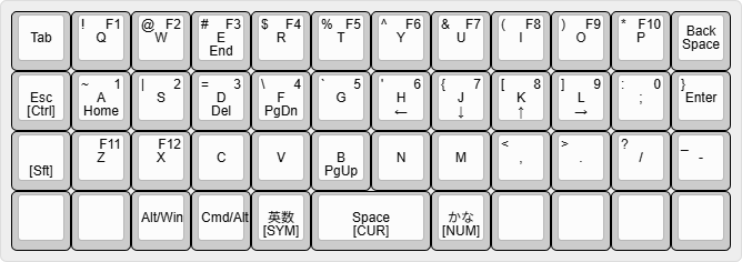 Edityhara配列(2024)2025-11-19Keebyhara配列(2024)は、私が2024年時点で使っていた40%キーボード向けキー配列である。 概要 ベースレイヤー 基本はQWERTY。 Aの左は、CtrlとEscを兼用している(単押しでEsc、長押しでCtrl)。QMK FirmwareではMT (Mod-Tap)という機能で実現できる。 Lの右にはセミコロンを置いている。これはAZIKのため。 Tweet Share